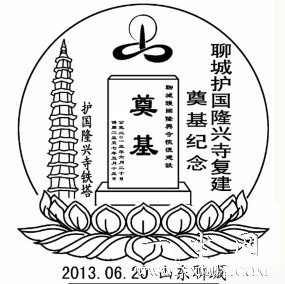 江北古刹聊城护国隆兴寺复建工程6月20日奠基,山东聊城邮政启用纪念邮戳。聊城护国隆兴寺復建奠基仪式于2013年6月20日举行。在聊城民间广泛流传着一首歌谣:"东昌有三宝,铁塔,古楼,玉皇皋。”这东昌三宝中之铁塔原本就是护国隆 兴寺的标志性建筑。