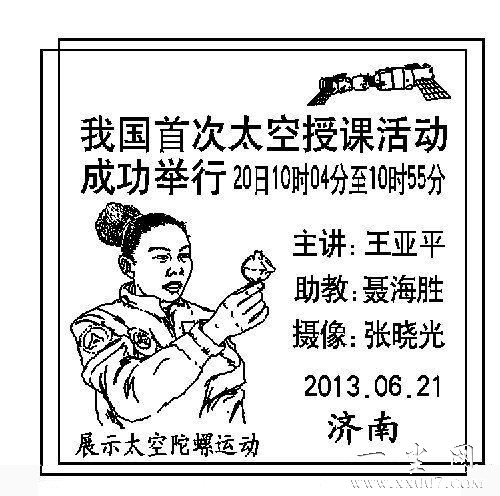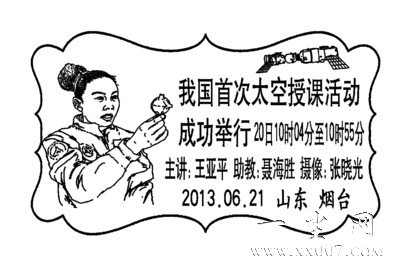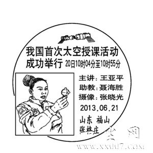 2013年6月20日10时4分至55分,正在经历太空之旅的三位神十宇航员,成功举办了我国首次太空授课活动,此次太空授课主要面向中小学生,使其了解失重条件下物体运动的特点、液体表面张力的作用,加深对质量、重量以及牛顿定律等基本物理概念的理解。航天员将进行在轨讲解和实验演示,并与地面师生进行双向互动交流。三名航天员由王亚平担当主讲,聂海胜担当助教,张晓光担当摄像。 上图为山东济南、烟台两地推出的太空授课活动纪念邮戳