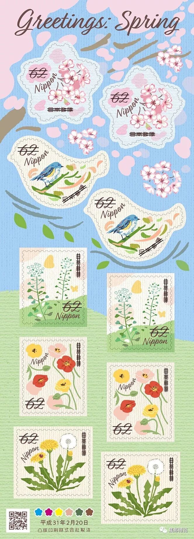 2019年2月20日,日本邮政发行一套《春季问候》邮票,包括两枚小版张10种20枚邮票,花鸟图案设计色彩淡雅,属于典型的日本风格。