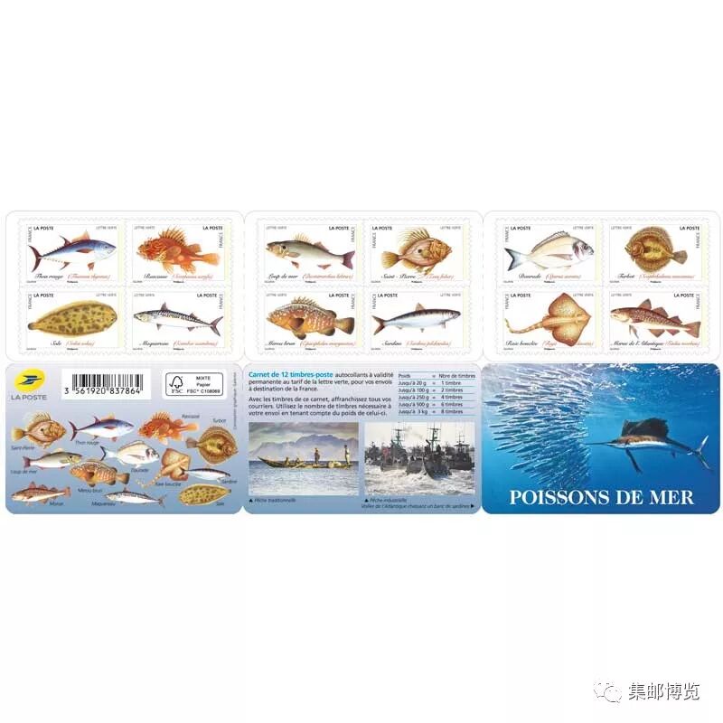 2019年2月11日,法国邮政发行一套12枚《鱼》小本票,主题为金枪鱼、鲭鱼、石斑鱼、沙丁鱼、海鲷、大菱鲆和鳕鱼等,由Henri Galeron设计。