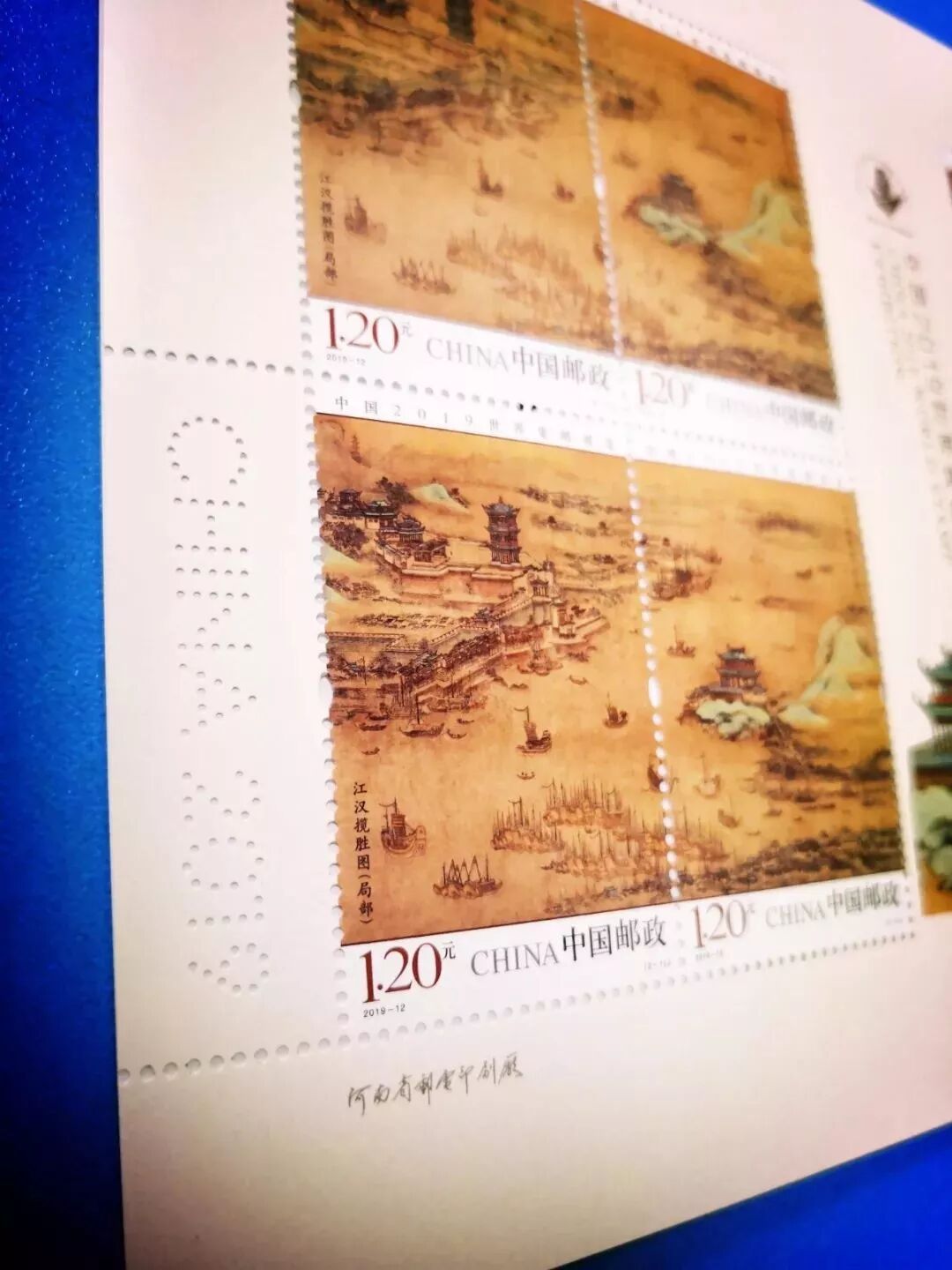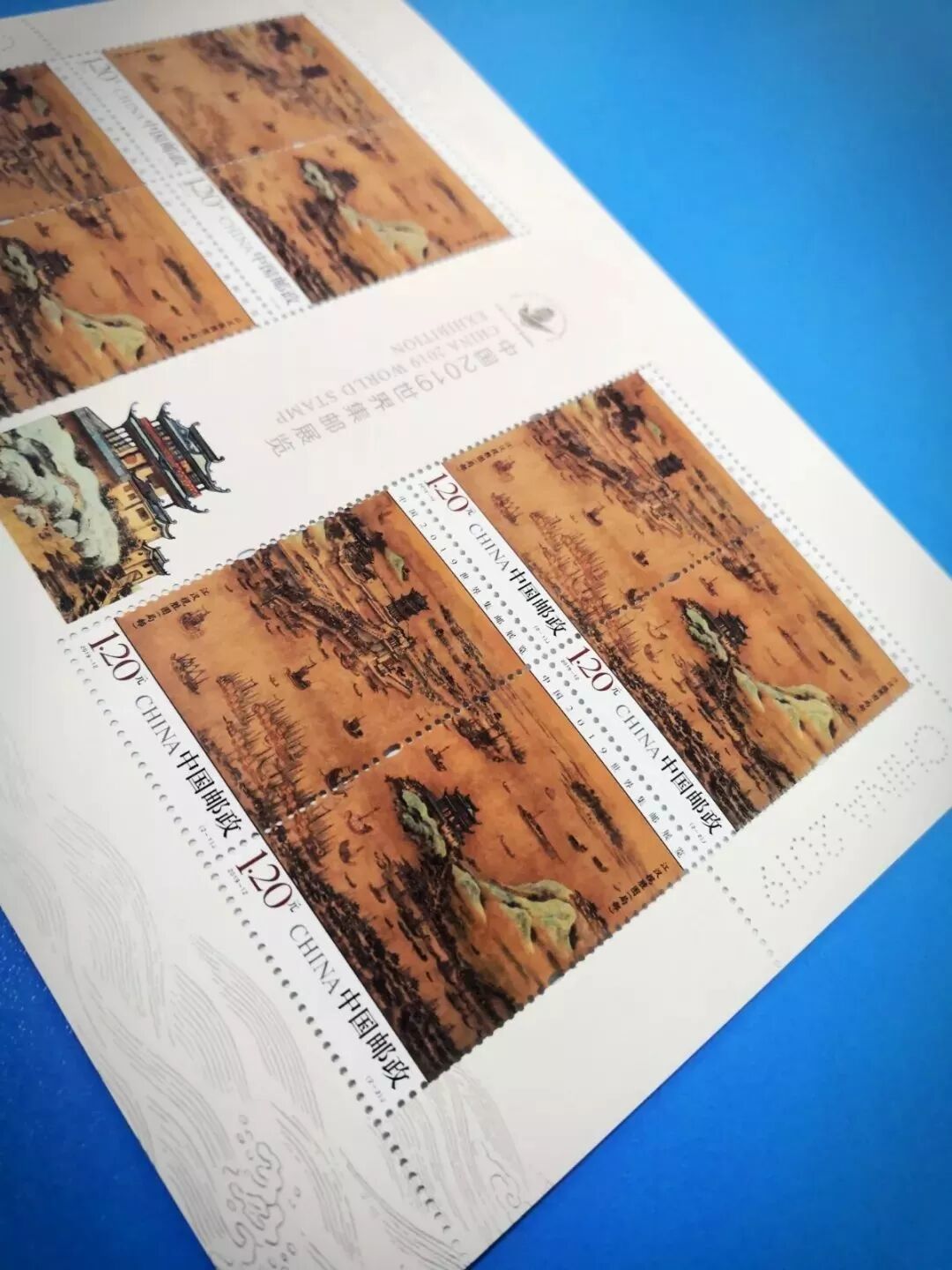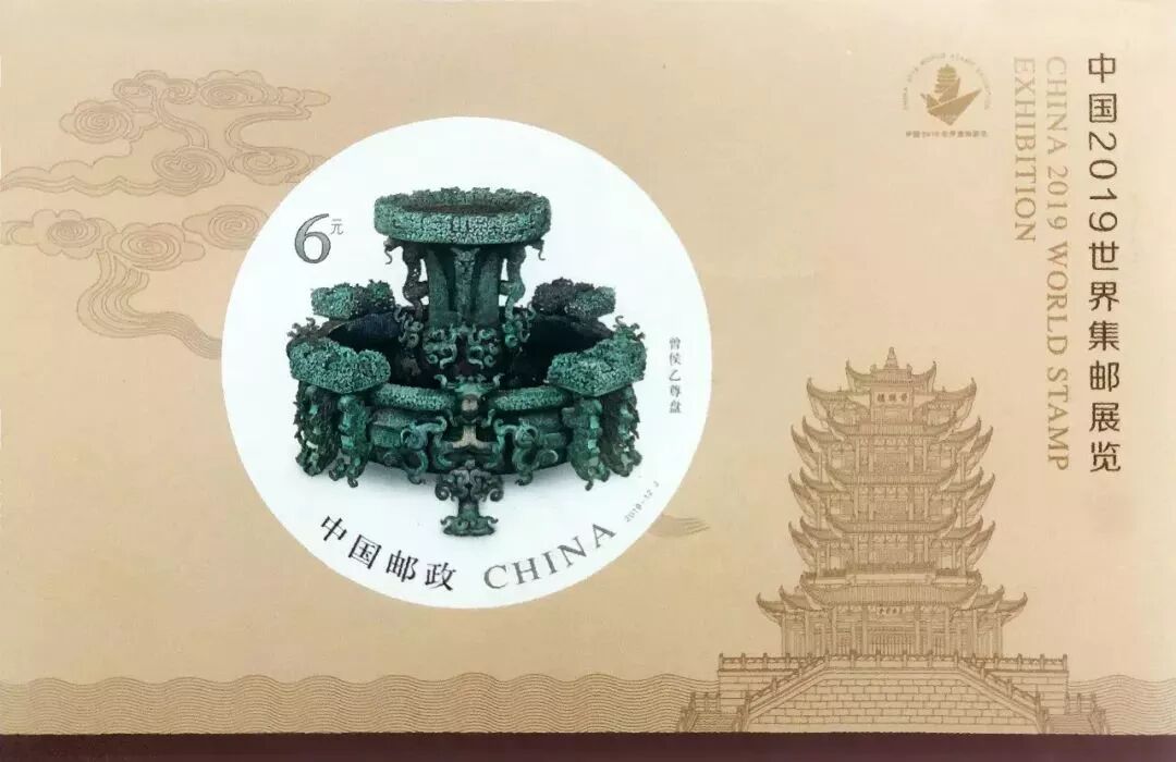 《中国2019世界集邮展览》邮票2枚,图案采用江汉揽胜图局部;小型张1枚,图案采用曾侯乙尊盘。