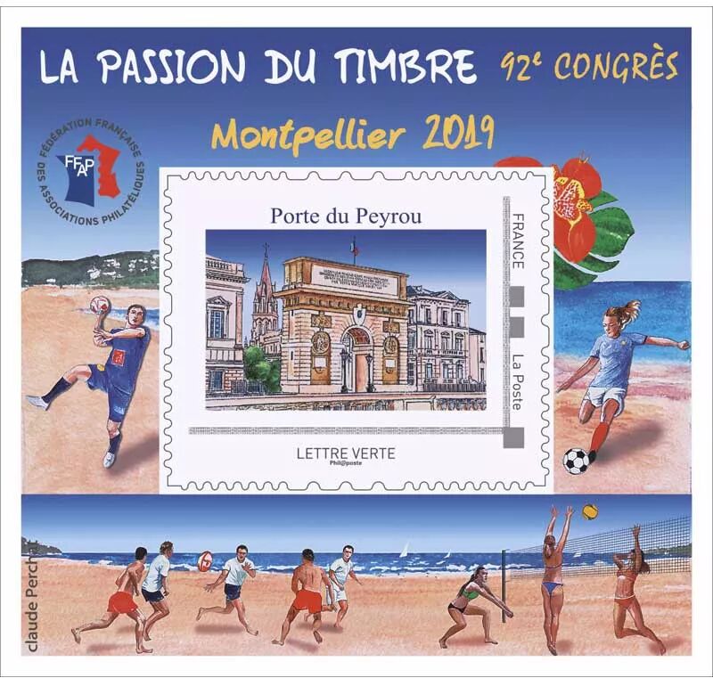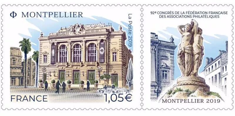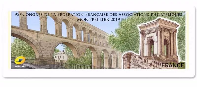 2019年6月7日,法国邮政为第92届法国集邮联合会联盟(FFAP)大会发行一枚纪念邮票、一枚小型张和一枚ATM邮票。本届大会在法国南部的蒙彼利埃举办,小型张图案为蒙彼利埃凯旋门,邮票主图为戏剧广场的蒙彼利埃歌剧院,副票图案为三女神喷水池。ATM邮票图案上是这里著名的嘉德水道桥,修建于古罗马时代,已经登上了世界遗产名录。