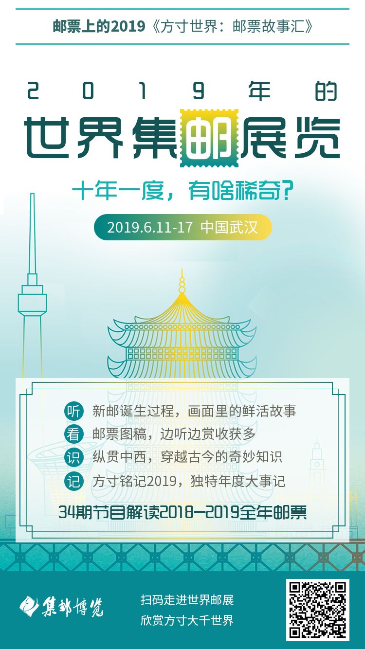 《中国2019世界集邮展览》纪念邮票一套2枚,小型张1枚,图案分别取自现藏于武汉博物馆的明代绢本画《江汉揽胜图》和现藏于湖北省博物馆的曾侯乙尊盘。