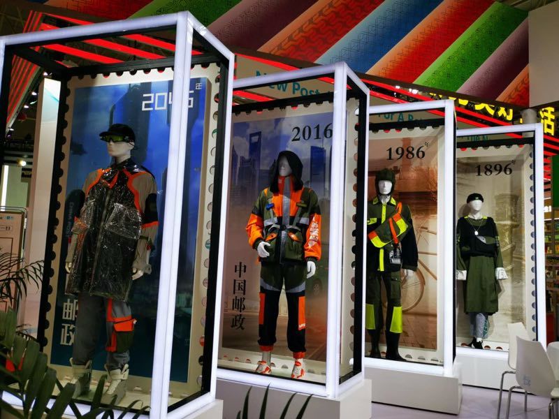 河南邮政展区此次还创意推出了四款邮政快递“潮服”,分别以1896、1986、2016、2046年为年代背景,以经典、时尚、科技的风格,展现邮递员全新形象,给观众带来了别样的文化体验。1896年,中国近代邮政诞生,邮差信使以“马上飞递 日行八百”的专业精神,千里走单骑,实现邮路通畅、信达天下;1986年,中国进入全面改革开放,邮政人以绿色邮递自行车行走天下,承载着“传邮万里 国脉所系”的重任;2016年,“互联网+”为邮政发展不断注入新的活力,现代化交通工具日益普及,但“为人民服务”始终是邮政人坚守的职责和义务;2046年,随着人工智能的快速发展,未来邮政必将进一步科技赋能,实现跨越性发展。展区现场以邮票的形式,将四个不同阶段的时代特点与邮政快递潮服进行组合展示,传达了中国邮政使命必达的信念。时代在变、工具在变,“人民邮政为人民”的初心始终不变,邮政人的理想与坚守始终不变。