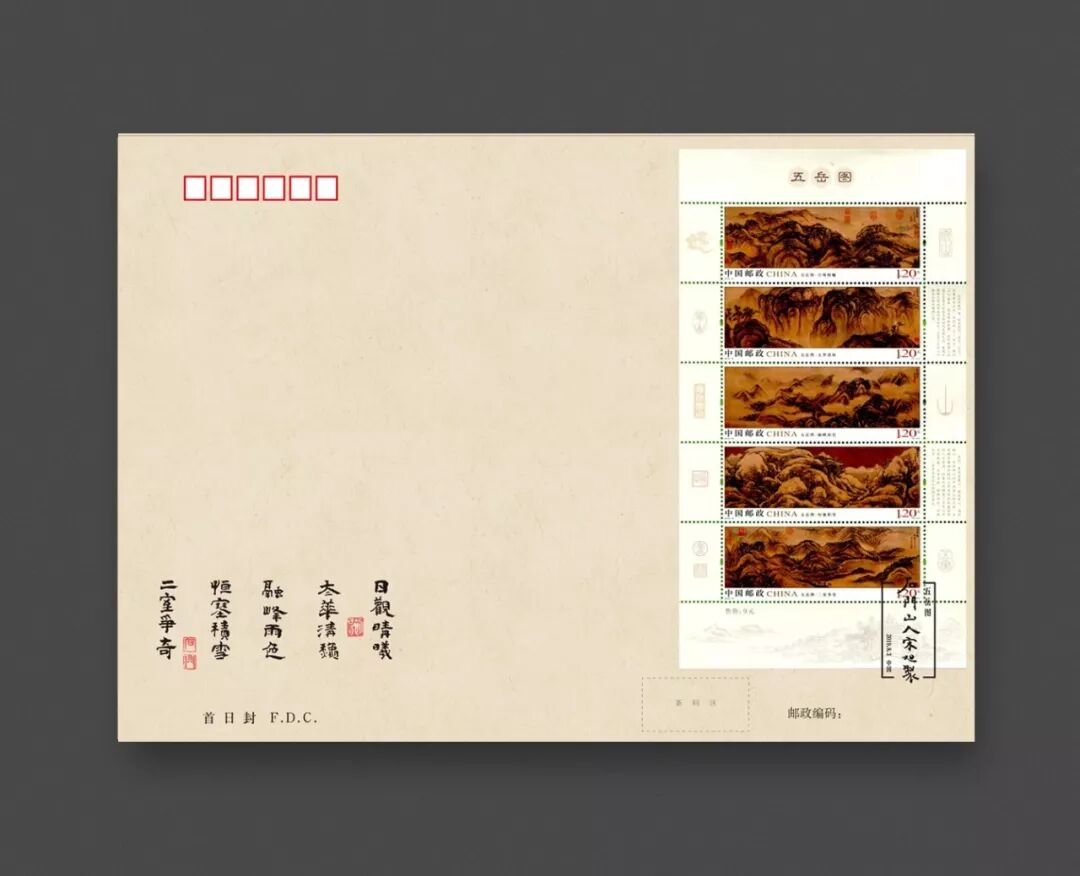 首日封1套5枚。因循《五岳图》各图主旨,首日封设计拟只选一角为背景,衬托宋旭手书画名及印章,着意凸显邮票,表达对古画本身及其作者的敬意。