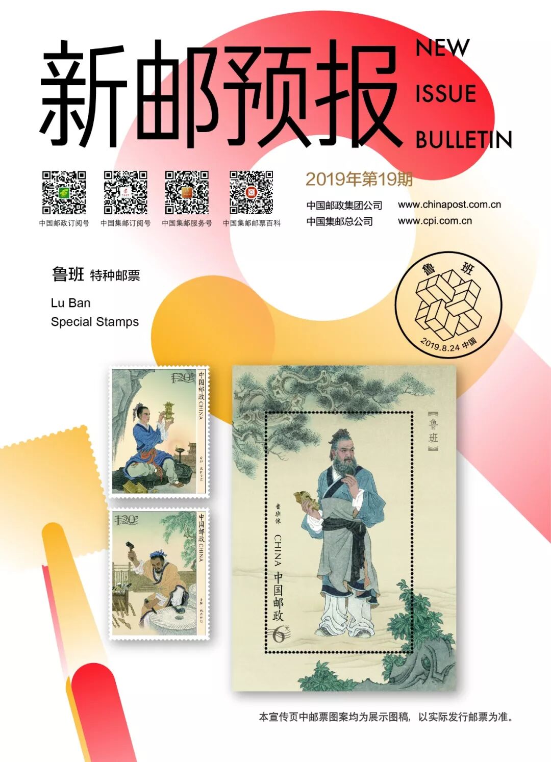 中国邮政定于2019年8月24日发行《鲁班》特种邮票1套2枚,小型张1枚。详情如下: