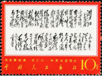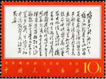文7《毛主席诗词》邮票,选用了13首毛泽东诗词,有毛泽东对青年时代往事的深沉回忆,有对革命战争时期人民武装斗争的热情讴歌,有对中国工农红军二万五千里长征不畏艰险的真实描写,也有对人民解放军占领南京的激情欢呼,从各个不同侧面反映了中国革命所走过的光辉历程和作者非凡的革命实践活动。毛泽东的书法博采众长,气势磅礴,纵横潇洒,错落有致,一气呵成,成为独具一格的“毛体”书法。雕刻师把毛泽东书法中跌宕起伏,节奏明快,神采飘逸,笔意奔放,气势磅礴的特点都较好地体现了出来。