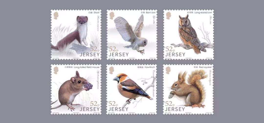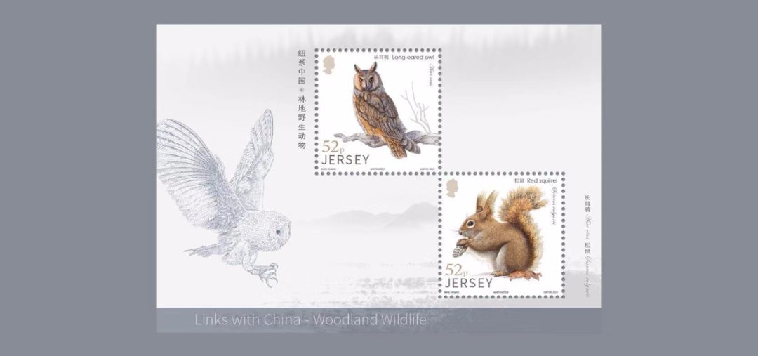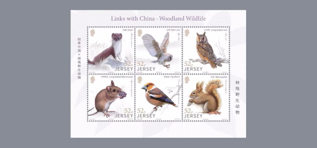 2019年9月2日,英属泽西岛邮政发行《2019年纽系中国:林地野生动物》邮票,全套6枚,同时发行包含2枚邮票的小全张和包含全套6枚邮票的小全张。