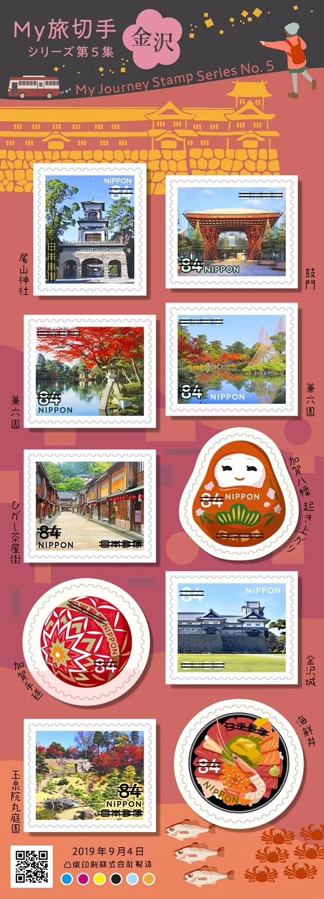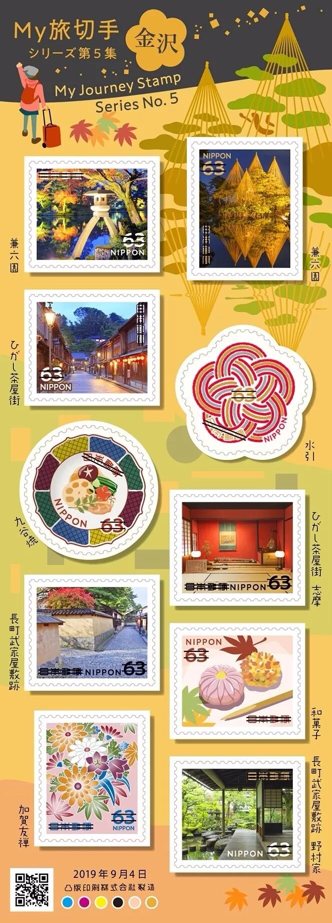 2019年9月4日,日本邮政发行《我的旅行》系列一套两枚小版张,主题为金泽。金泽市是位于日本石川县的城市,也是石川县的县厅所在地。这里的兼六园与冈山的后乐园、水户的偕乐园齐名,称为日本的“三大名园”,是日本政府指定的特别名胜。