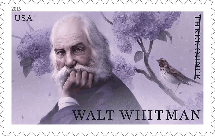 2019年9月12日,美国邮政发行《文学艺术》系列第32种邮票,主题为纪念诗人惠特曼(Walt Whitman, 1819—1892)诞辰200周年。惠特曼创造了诗歌的自由体,其代表作品是诗集《草叶集》。此枚邮票图案上的诗人肖像是根据1869年拍摄的照片设计的,背景表现的是《当紫丁香最近在庭园中开放的时候》,这是诗人在1865年6月为纪念林肯而创作的一首长诗。