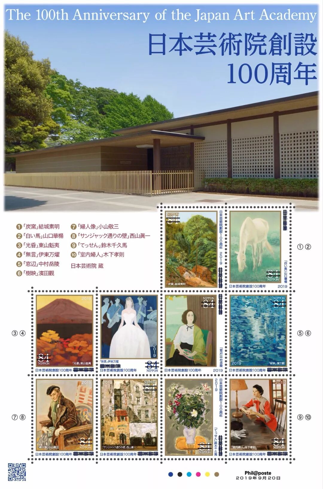 2019年9月20日,日本邮政为日本艺术院成立100周年发行一套10枚邮票和一枚小版张。日本艺术院是日本文化厅下属的特别机构,是为了向在艺术上取得卓越成绩的艺术家提供优厚待遇的荣誉性机构,进入该院的艺术家每年都可以获得250万日元(折合人民币约20万元)的年金。其会员名额在120人以内,实行会员终身制。1919年,帝国美术院成立。1947年改称日本艺术院。