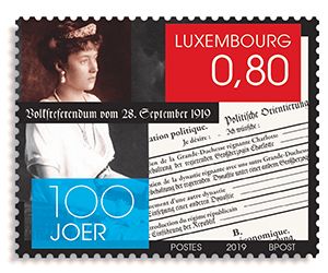 2019年9月17日,卢森堡邮政发行一枚邮票纪念1919年公投100周年。1919年9月28日,卢森堡举行了全民宪法公投,77.8%的人赞成夏洛特女大公作为国家元首,建立君主立宪制。