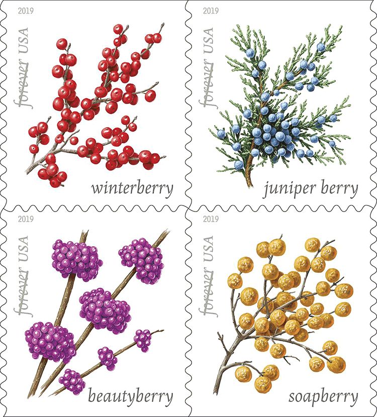 2019年9月17日,美国邮政发行一套4枚《冬季浆果》邮票,表现冬浆果(Ilex verticillate)、杜松果(Juniperus communis)、紫珠(Callicarpa Americana)和无患子(Sapindus Saponaria)。