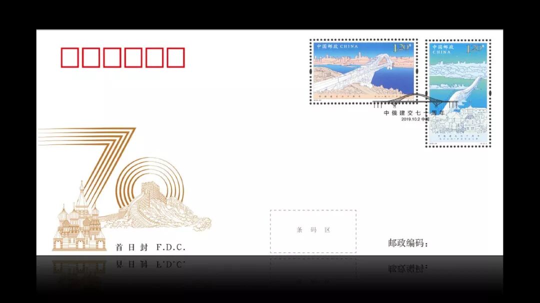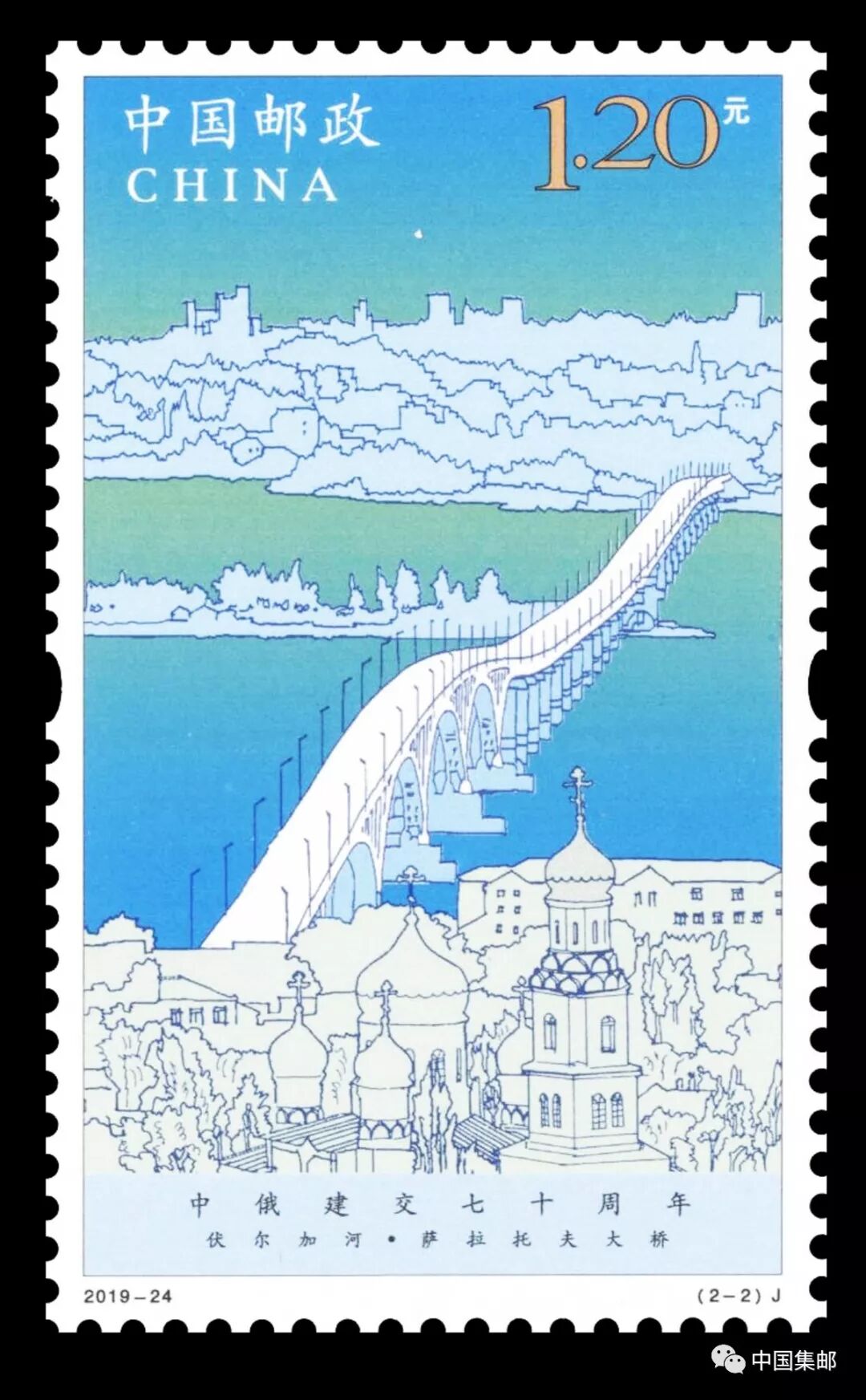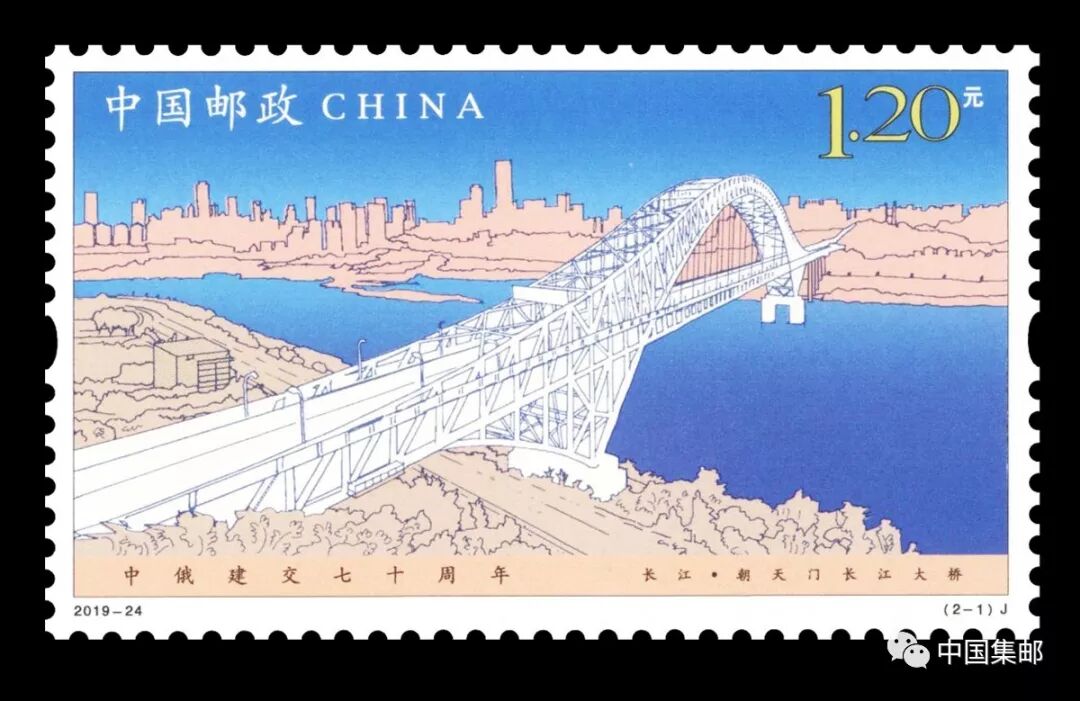 今年是中华人民共和国与俄罗斯联邦建交70周年,中国邮政定于2019年10月2日发行《中俄建交七十周年》纪念邮票1套2枚,邮票图案名称分别为:长江·朝天门长江大桥 、 伏尔加河·萨拉托夫大桥,全套邮票面值为2.40元。