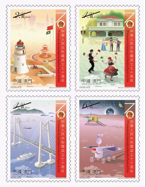 10月1日,发行《中华人民共和国成立七十周年》邮票1套4枚,面值分别为澳门币2.5圆、4圆、4.5圆及6圆。同时推出小型张,面值为澳门币12圆。