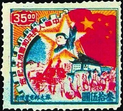 1949年11月1日,由东北解放区旅大邮电管理局发行的《中华人民共和国成立纪念》邮票1套1枚,邮票图案以北京的前门为背景,左侧半圆形立体齿轮上印有 “1949”和“中华人民共和国成立纪念”红色棣书票名,右侧是一面迎风飘扬的五星红旗和一颗光芒四射的五角星,五角星内绘有毛泽东主席挥动左臂的形象,国旗下勾画岀长城、工厂、机器和群众游行队伍。左上角印有阿拉伯数字“35”,左下角、右下角分别印有“旅大邮电管理局”、“叁拾伍圆”(当时的解放区币面值)蓝色楷书字样。这枚邮票是中国邮票中第一枚展现出新中国国旗——五星红旗图案的邮票,其主题鲜明,画面热烈、醒目,色彩鲜艳,充分表达了广大人民群众对共产党和毛主席无限热爱和崇敬之情;展现了全国各族人民纵情地欢呼新中国的诞生的场景;寓意着中国人民在中国共产党和毛主席的领导下,万众一心,为建设新中国而自力更生、奋发图强、勇往直前。