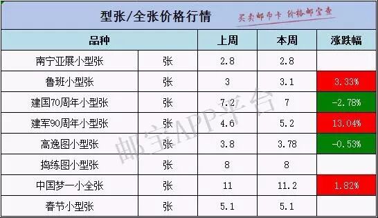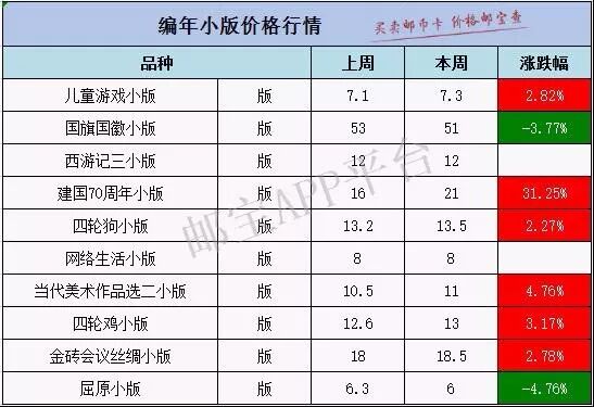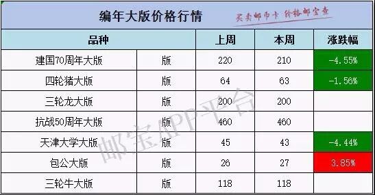 价格变化较大的有 建国70周年大版本周最新行情为210元,上周均价为220元,下跌4.55%。 四轮猪大版本周最新行情为63元,上周均价为64元,下跌1.56%。 天津大学大版本周最新行情为43元,上周均价为45元,下跌4.44%。 包公大版本周最新行情为27元,上周均价为26元,上涨3.85%。 更多品种价格变化请见下表