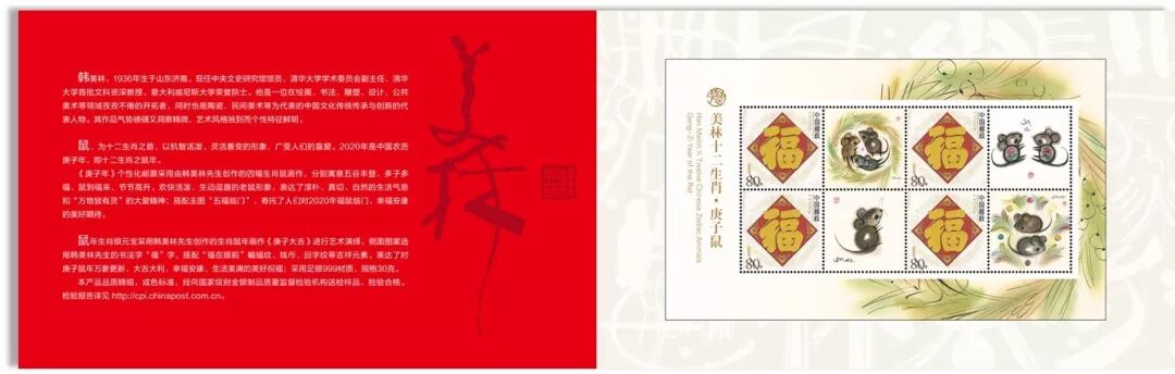 《韩美林十二生肖·庚子鼠》个性化邮票采用由韩美林创作的四幅生肖鼠画作,分别寓意五谷丰登、多子多福、鼠到福来、节节高升;搭配主图“五福临门”,寄托了人们对2020年福鼠临门、幸福安康的美好期待。