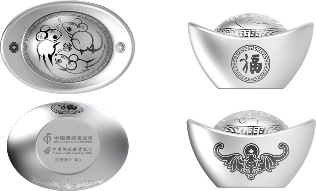 元宝正面图案由韩美林画作《庚子大吉》进行艺术演绎,主题为“鼠谷丰登”,装饰钱币图案,象征着五谷丰登、生生不息、生活富足的好兆头;侧面图案选用韩美林书法字“福”与传统吉祥图案“福在眼前”,寓意万象更新,福气满满;元宝底部有“中国集邮总公司”、“中国邮政储蓄银行”落款。