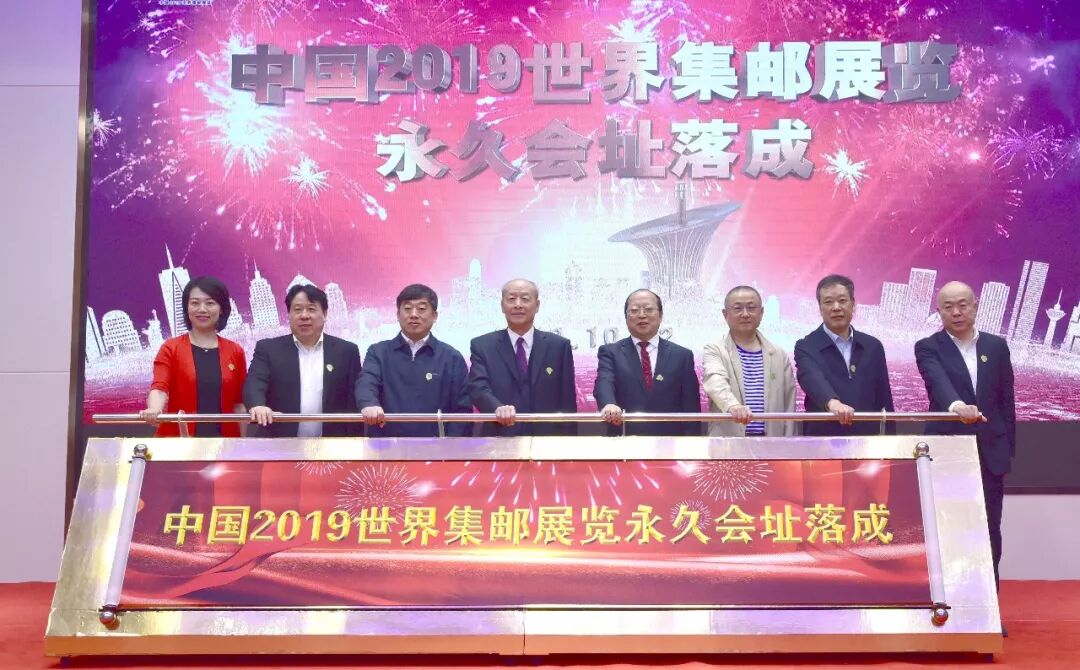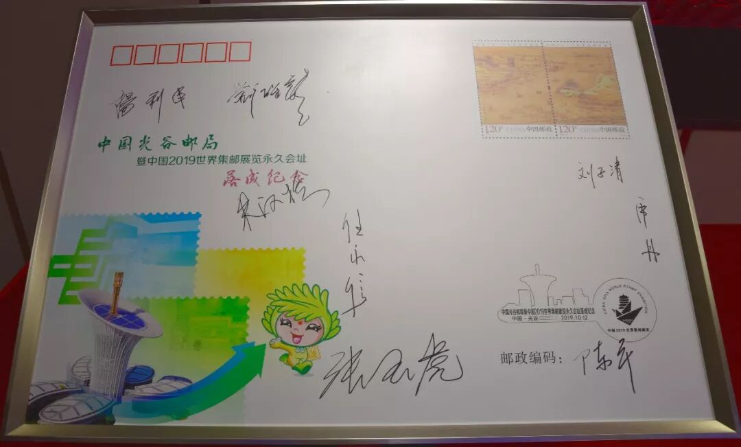 仪式最后,杨利民、张玉虎、朱汉桥、刘醒龙、任永信、刘子清、陈平、席丹共同为中国2019世界邮展永久会址落成揭幕,并在巨型纪念封上签名留念。
