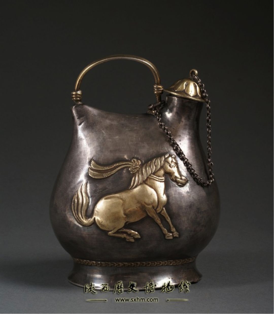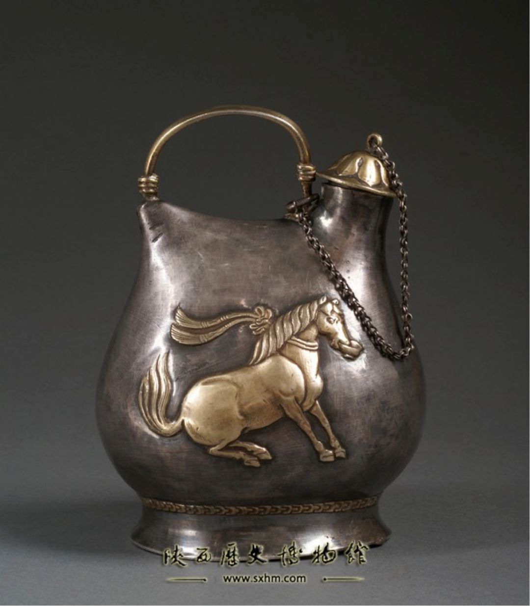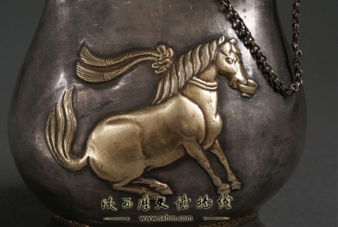 壶身是先将一整块银板捶打出壶的大致形状,再以模压的方法在壶腹两面模出两匹相互对应奋首鼓尾、衔杯匐拜的舞马形象,然后再将两端黏压焊接,反复打磨致平,几乎看不出焊接的痕迹。想当年工匠们的手艺可谓是鲁班再世!