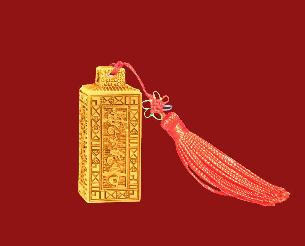足金灌顶、福禄齐天:天印,镶嵌黄金福印谱一枚,使用1克足金制成,即以足金(黄金)“灌顶”,一方黄金印,谓鸿福齐天。