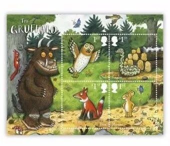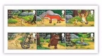2019年10月10日,英国邮政发行一套6枚邮票和一枚包含4枚邮票的小全张,纪念儿童图书《咕噜牛》出版二十周年。《咕噜牛》是作家朱莉娅·唐纳森和插画作家阿克塞尔·舍夫勒在1999年推出的童话书,至今已经卖出了1000多万本,在英国可谓家喻户晓。故事只有700个单词,道理也很浅显,是适合3到7岁小孩阅读的读物,被BBC改编为卡通之后非常受欢迎。