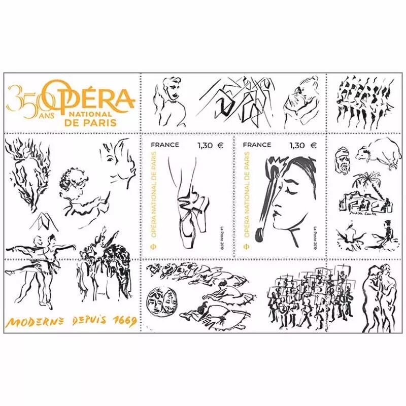 2019年10月21日,法国邮政为巴黎国家歌剧院建院350周年发行一枚包含两枚邮票的小全张。1669年,法国皇家歌剧学院成立,即今日巴黎国家歌剧院的前身。这座艺术殿堂见证了无数法国音乐艺术史上的里程碑和歌剧这一音乐体裁的变革和发展。吕利、拉莫、格鲁克、罗西尼、多尼采蒂、威尔第、古诺、瓦格纳等音乐大师都曾将自己的杰作献给这座历史悠久的舞台。