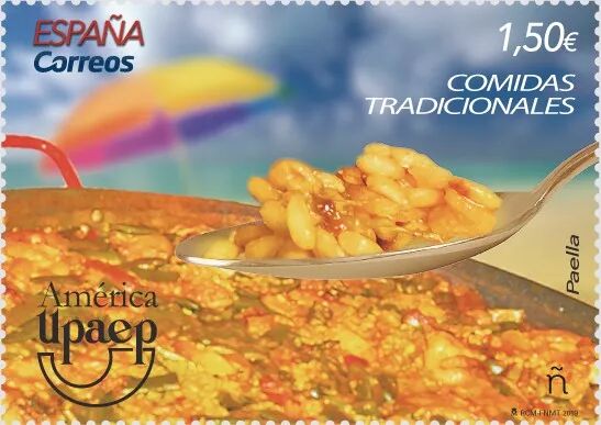 2019年10月11日,西班牙邮政发行一枚今年的美西葡邮政联盟系列邮票,主题为西班牙海鲜饭。美西葡邮政联盟是1911年在乌拉圭邮政总长的倡议下成立的。从1989年开始,各成员国联合发行主题邮票,今年的主题为传统美食。传说15世纪时,哥伦布航海时曾遭到一次飓风袭击,逃生到一个小岛上,当地渔民用海鲜和米饭做了锅大杂烩,救了饥寒交迫的哥伦布一命。后来哥伦布回到西班牙后,跟国王说起这件事,国王就命令宫廷御厨到小岛学做海鲜饭,以后王宫里就用海鲜饭招待最尊贵的客人。就这样,海鲜饭从渔民的餐桌搬到了国王的宴席上,从此,海鲜饭成了西班牙的“国饭”。