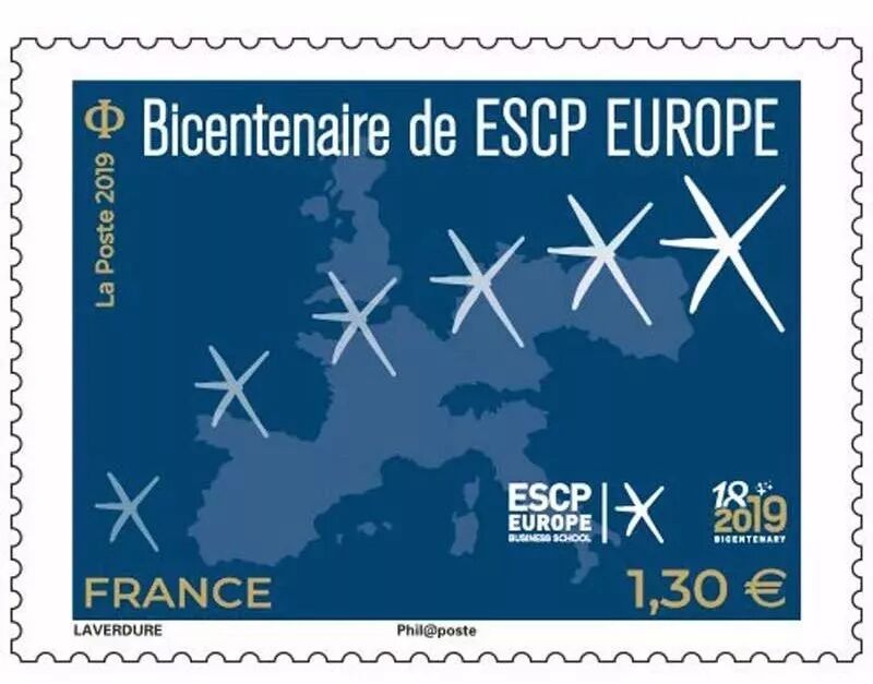 2019年10月14日,法国邮政为欧洲高等商学院建校两百周年发行一枚纪念邮票。欧洲高等商学院(ESCP-Europe)建立于1819年,是世界上第一所商学院,被认为是欧洲最顶尖的商学院之一,学校立足于欧洲,旨在培养具有跨文化背景的未来商界领袖。