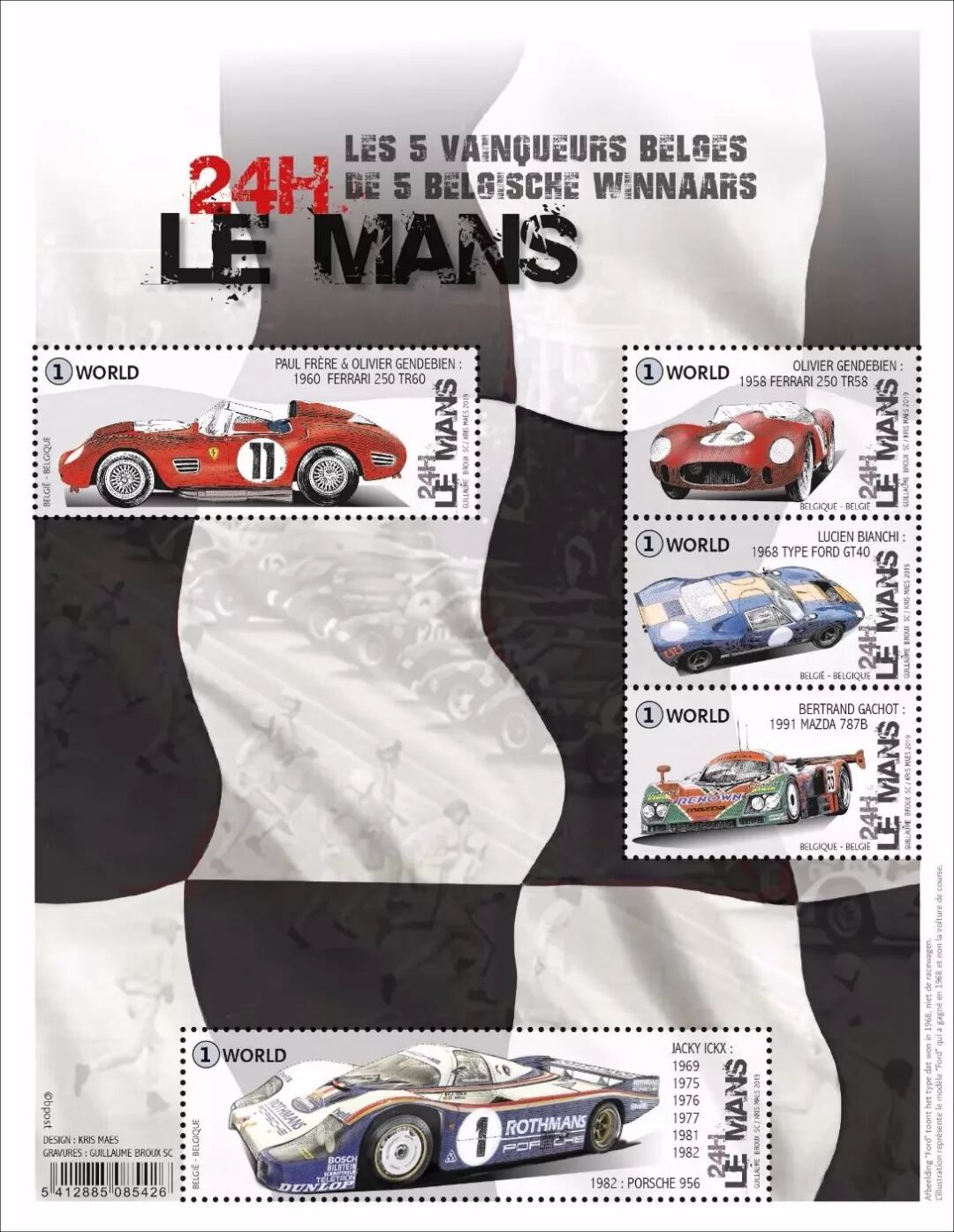 2019年10月21日,比利时邮政发行一套5枚《勒芒24小时耐力赛》邮票和一枚小全张。勒芒位于法国巴黎西南约 200公里处,这个小城市能够闻名于世界,主要是因为自1923年开始(1936年、1940~1948年除外),每年6月举行的被称为最辛苦的单项赛事——“勒芒24小时耐力赛”。该赛事以3位车手为一个车组,驾驶一台赛车,完成连续24个小时的竞赛。这次发行的5枚邮票展现了比利时人的车队夺冠的年份。