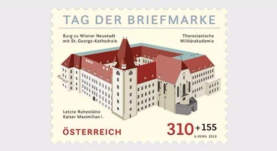 2019年10月18日,奥地利邮政发行一枚今年的邮票日系列邮票,主题为维也纳新城城堡。维也纳新城是位于奥地利首都维也纳以南的下奥地利州的一个城市。这里曾经是弗里德里希三世的首都。这枚邮票也是为了庆贺维也纳新城集邮俱乐部创建百年,同时,今年的奥地利全国集邮协会邮展也在这里举办。