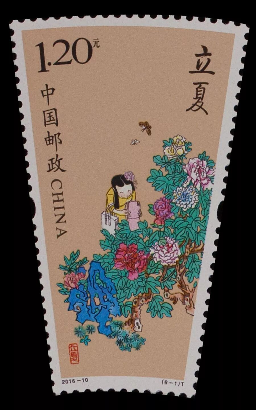 邮票第一图立夏,以牡丹作为节气特征,描绘了现实生活中一位女子观赏牡丹的场景。
