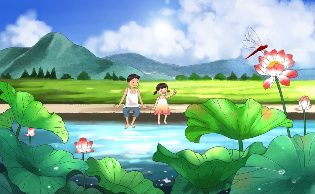第四图夏至,以荷花作为节气特征,描绘了孩童在荷塘边玩耍嬉戏的场景。