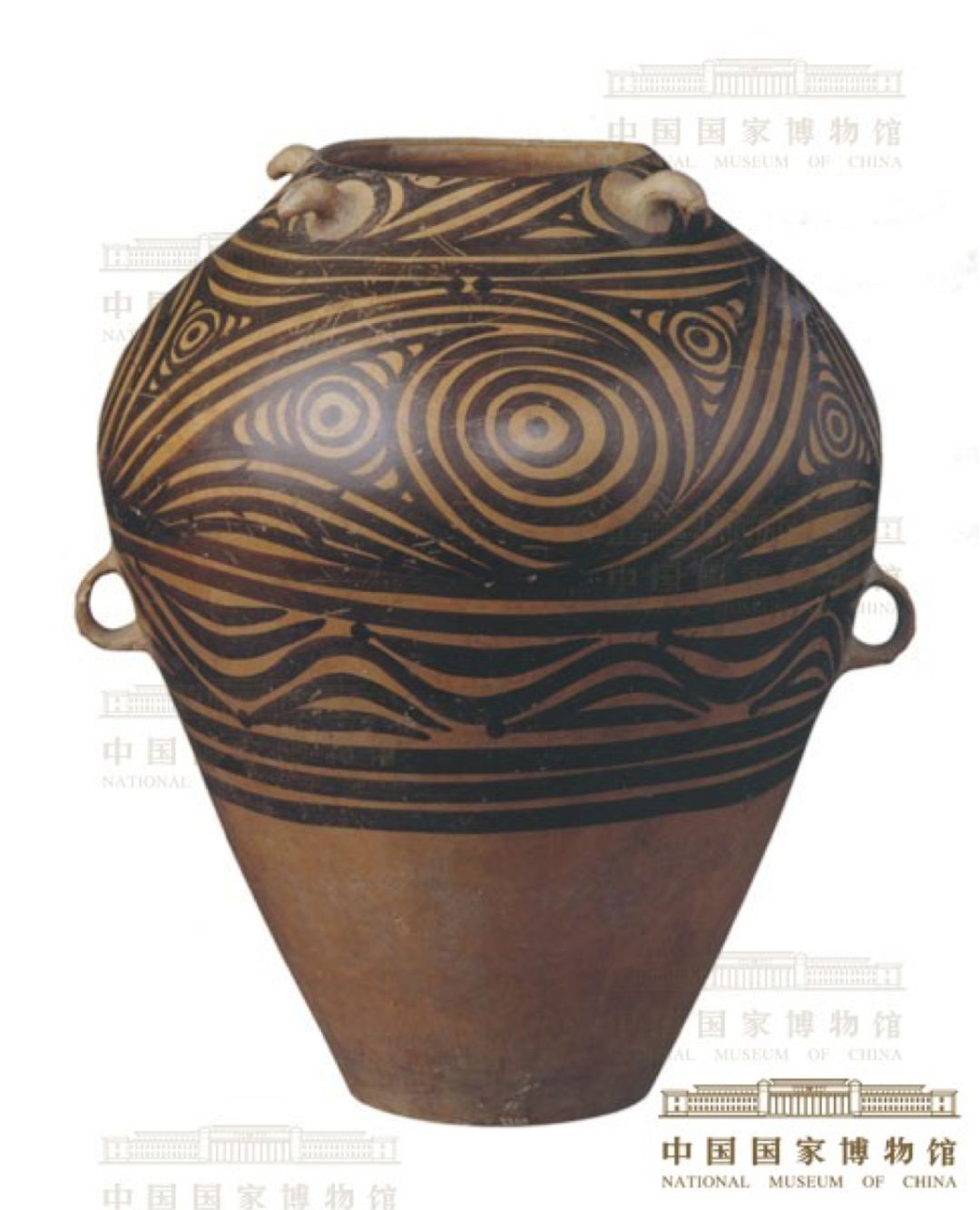 口沿外侧有四个钩状泥突形成四系,腹部两侧有对称的环状耳器表饰黑彩,上腹部有旋涡纹绕器一周,在2个大旋涡纹之间各再绘出2个小旋涡纹,旋涡纹带以下有一周水波纹带和弦纹带加以承托。整个画面既像水面被雨滴击起的层层涟漪,又仿佛是湍急的河水激流涌动而形成的一个个大小旋涡。
