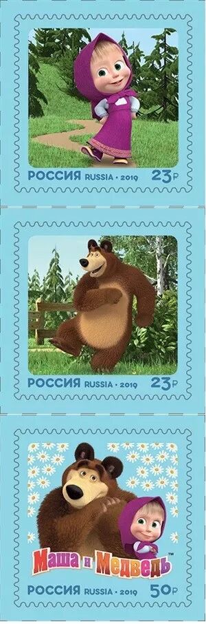2019年10月22日,俄罗斯邮政为卡通《玛莎和熊》发行一套3枚邮票。《玛莎和熊》是俄罗斯家喻户晓的系列动画片,可爱、伶俐的玛莎和憨态可掬的大熊以充满了童趣的故事、热闹轻松的情节和活泼顽皮的表演成为一部热门卡通。