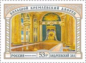 2019年10月21日,俄罗斯邮政发行一枚邮票,介绍克里姆林宫的安德鲁大厅。圣安德鲁大厅与亚历山大厅相邻,同样位于宫殿上层南侧,色调以蓝色和金色为主调。20世纪90年代这里恢复原貌,此后的俄罗斯总统的就职仪式都在这座大厅举行。