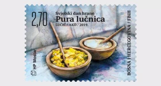 2019年10月16日,波黑邮政发行一枚世界粮食日邮票。2019年10月16日是第39个世界粮食日,主题是“行动造就未来,健康饮食实现零饥饿”。邮票图案上的食品是大蒜黄油酱和波伦塔,这是一种浓稠的玉米粥,冷却之后还可以作为玉米糕。