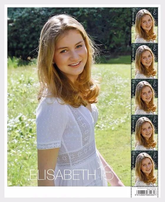 2019年10月21日,比利时邮政发行一枚伊丽莎白公主邮票。伊丽莎白公主(布拉班特女公爵,全名:伊丽莎白·特蕾莎·玛丽·海伦娜)2001年10月25日出生,她是比利时的菲利普国王和王后马蒂尔德的第一个孩子,今年18岁了。根据比利时王室的继承法,不分男女,只看长幼,因此她是比利时王位第一顺位继承人,即未来的比利时首位女王。