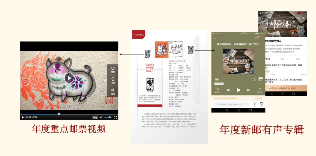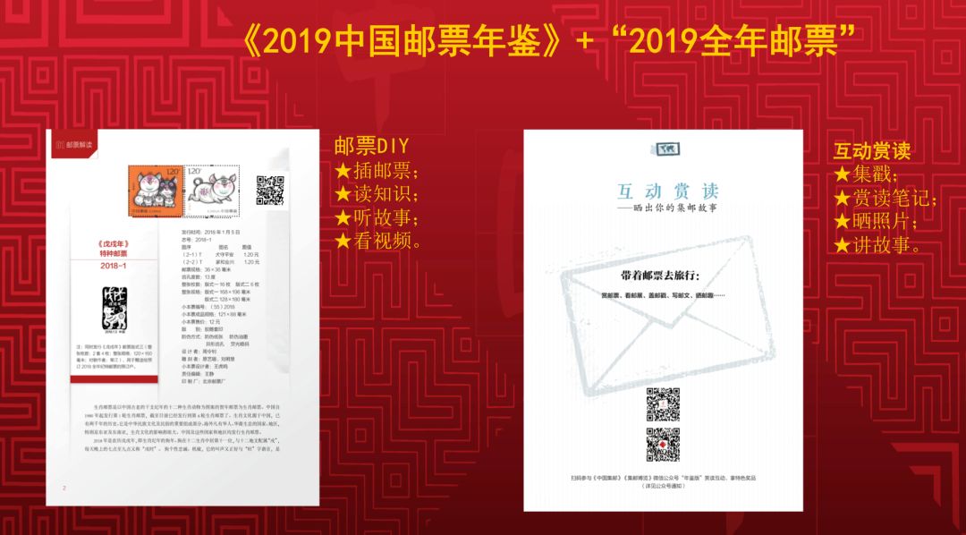 《2019中国邮票年册》 DIY年鉴版不仅内含全年套票、小型张、小全张,而且预留了邮票位,朋友们可以自行插入相关内容页面,边看边玩趣味盎然;当欣赏到年度重点邮票的时候,可以用手机轻扫二维码,即可观看在线视频解读;或者倾听年度新邮有声特辑。