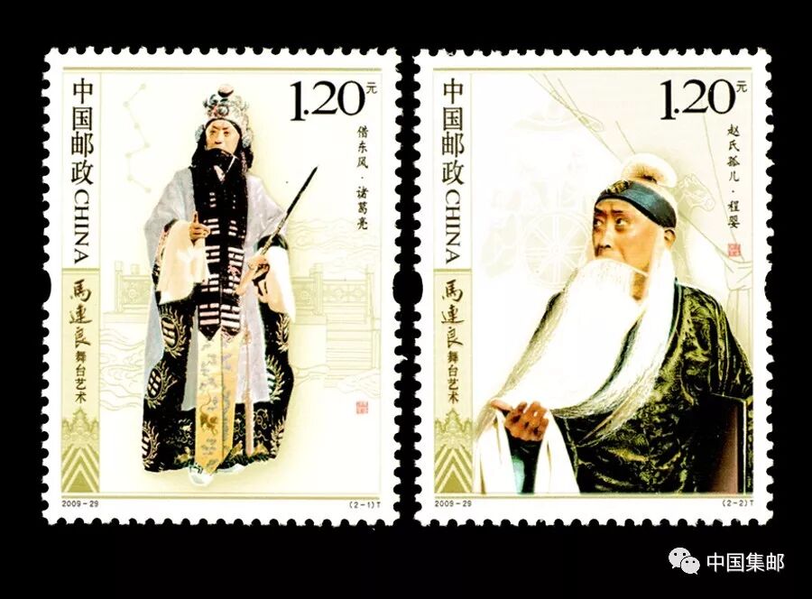 让我们再把目光投向2009年。“2009-29 马连良舞台艺术”全套2枚,分别表现了马连良先生表演的《借东风》和《赵氏孤儿》两段京剧剧目,因此小编认为将该套邮票命名为“马连良京剧艺术”也未尝不可。但或许是为了与之前发行的“纪94”相呼应,该套邮票保留了“舞台艺术”的命名传统。