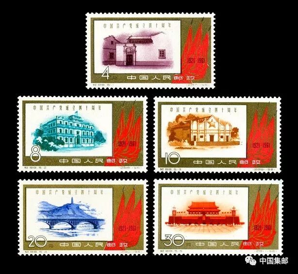 1961年7月1日,为庆祝中国共产党成立40周年,中国邮政发行了纪念邮票1套5枚。
