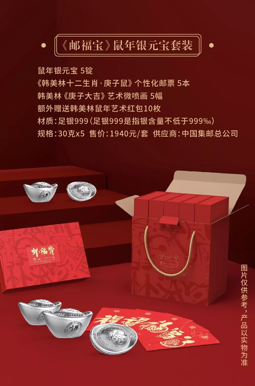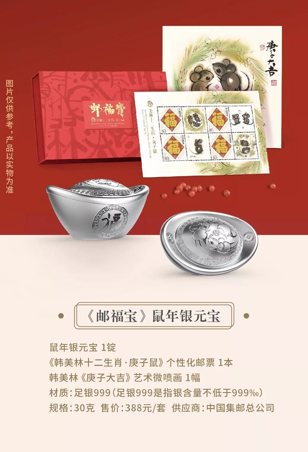 《邮福宝》鼠年银元宝采用足银材质打造,工艺精湛。整套产品蕴含了对庚子鼠年的吉祥祝福,集生肖文化、大师艺术神韵及货币文化于一身,可收藏家传,送礼更体面。