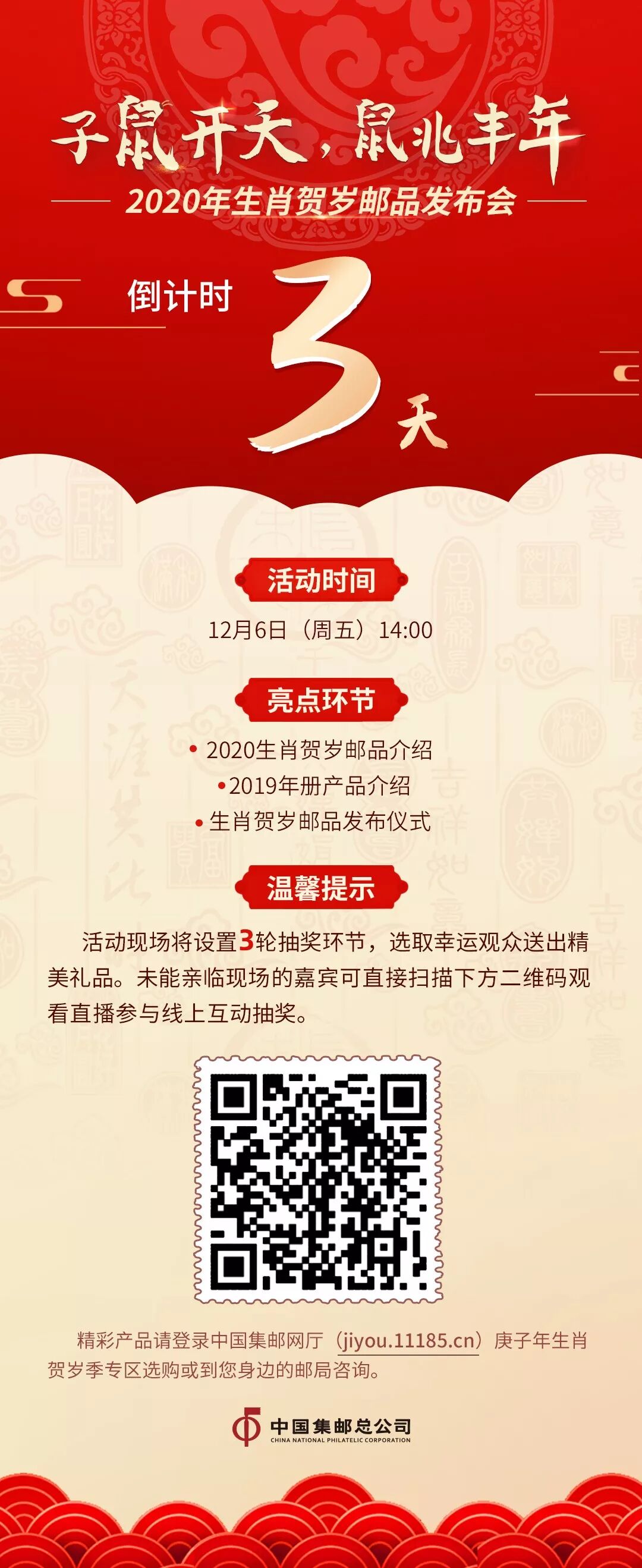届时,现场观众将共同见证2020庚子年生肖系列邮品和2019年年册的发布,2020庚子年生肖原地邮局也将隆重亮相。同时,我们还为观众准备了精美礼品,回馈大家,感谢大家对中国集邮的持续关注和热爱!