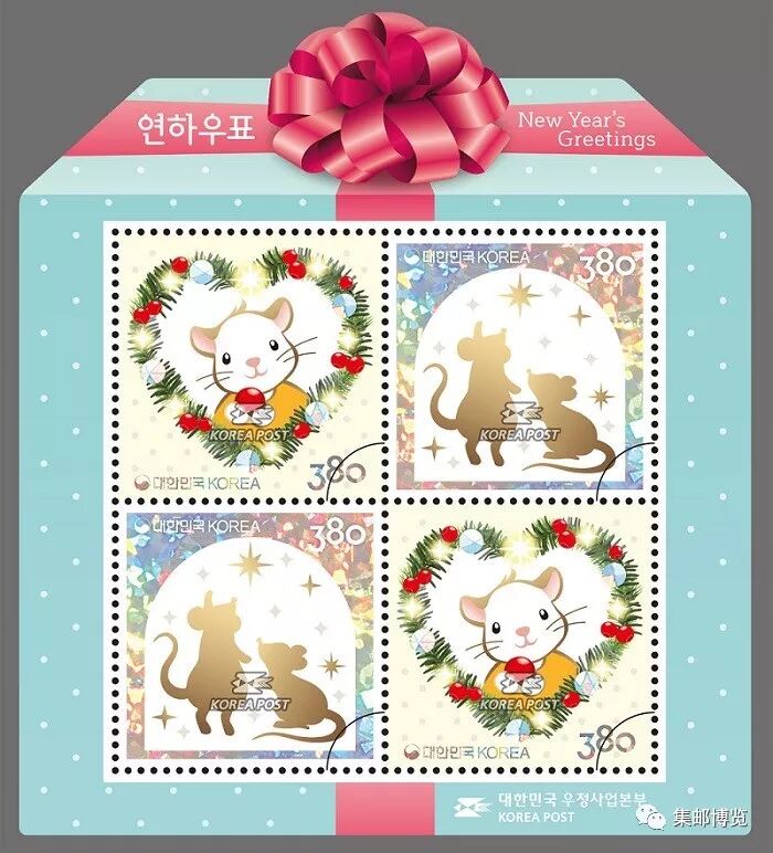 2019年12月2日,韩国邮政发行一套两枚农历生肖鼠年邮票。这套邮票的设计颇有新意,将圣诞元素加入到生肖邮票设计之中。
