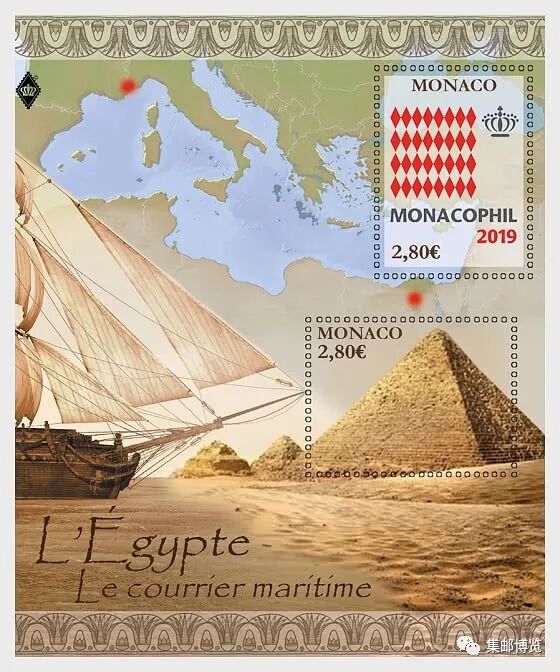 2019年11月28日,摩纳哥邮政发行一枚今年的摩纳哥邮展小型张。今年的摩纳哥邮展于11月28日至30日举办,除了国王夫妇的邮集之外,还展出100多件邮政史珍贵文件。今年邮展的主题是埃及和海上邮路。