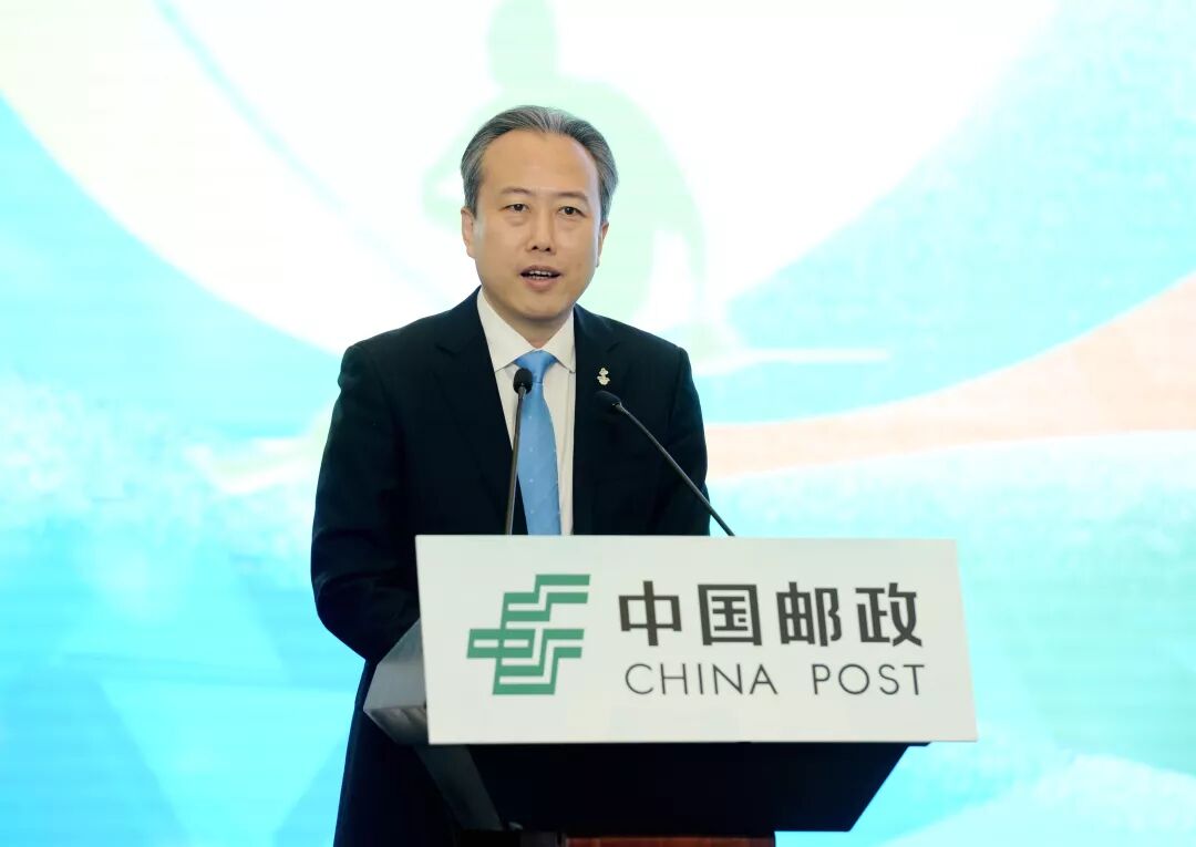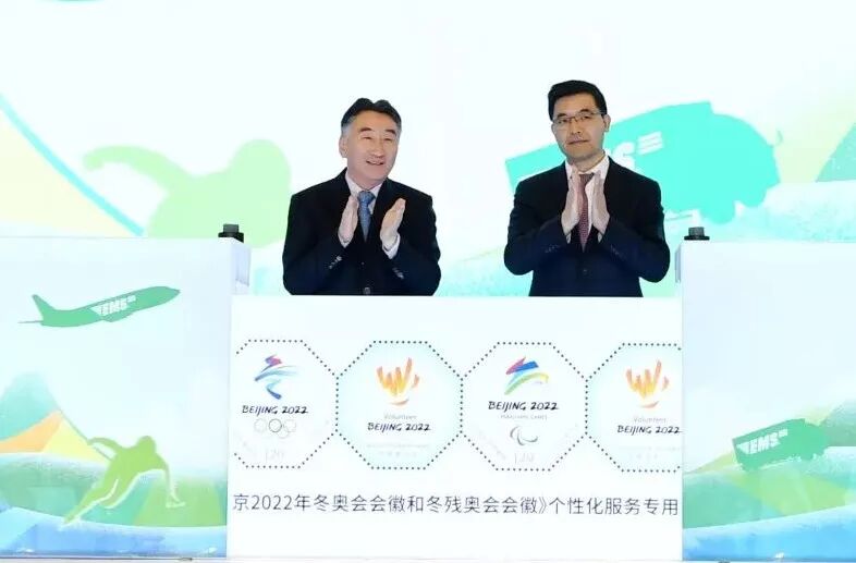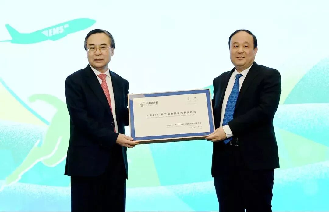 发布会上,北京冬奥组委副秘书长何江海向中国邮政集团公司董事长刘爱力颁发北京2022年冬奥会和冬残奥会官方邮政服务独家供应商铭牌。