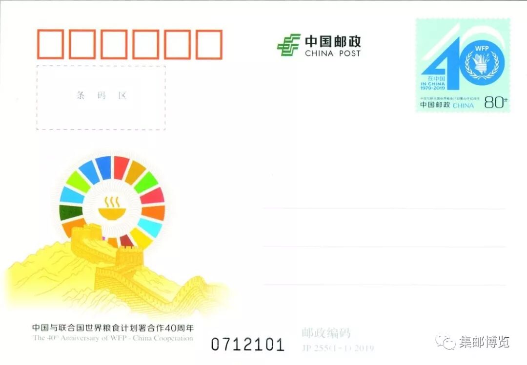 中国邮政定于2019年12月19日发行《中国与联合国世界粮食计划署合作40周年》纪念邮资明信片1套1枚。详情如下: