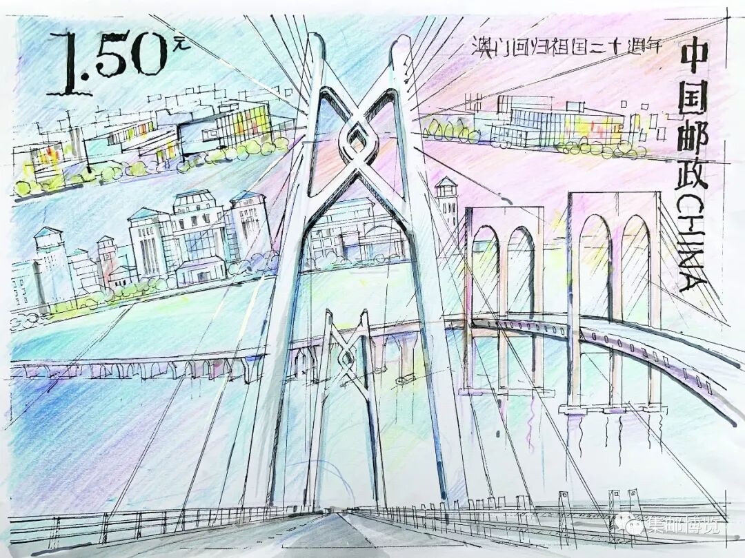 韩老师介绍,《澳门回归祖国二十周年》与《粤港澳大湾区》两套邮票于今年5月同时约稿,设计是穿插交叉进行的,由于自己对澳门感受更为深刻,加之这套邮票的内容相对集中,表现范围不像粤港澳大湾区那么广,牵涉面也没有那么多,所以,设计比较顺利,在“大湾区”邮票完成3周后就提交了这套邮票的设计稿。