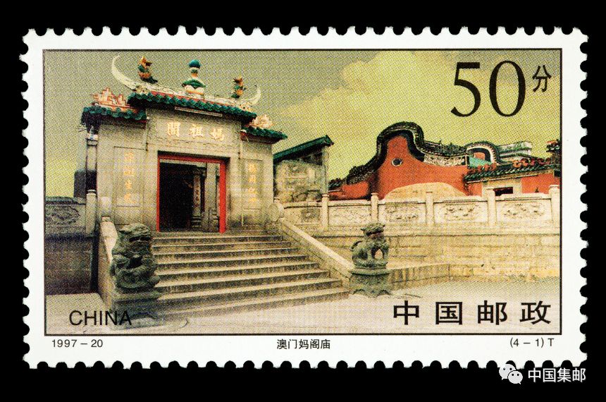 1997-20 《澳门古迹》特种邮票中4-1完整的展现了妈阁庙的风貌,画面将庙门放在醒目位置,山门石坊横刻“妈祖阁”三字,两边刻门联“德周化雨;泽润生民”。山门顶上有定海针、鲤鱼咀等瓷饰物,门前一对石狮,飞檐凌空,极富中国民族特色。
